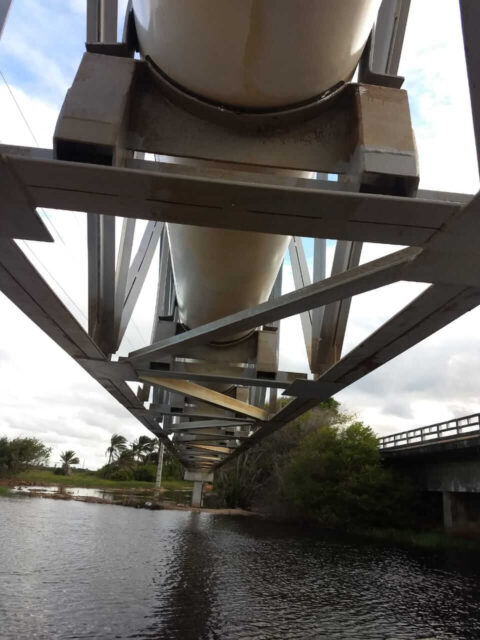 A travessia sobre o Rio Capivara foi projetada em estrutura metálica do tipo treliçada vencendo um vão livre de 40m. A estrutura suporta uma adutora de água de DN 600mm que foi concebida para garantir a distribuição na Região de Machadinho Norte.